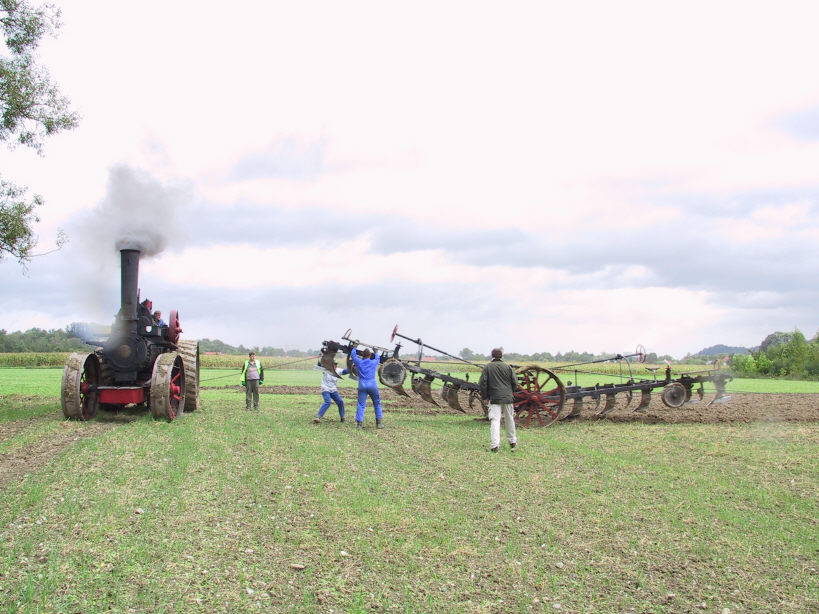 Die interessanteste Anwendung von Lokomobilen ist aber wohl das Dampfpflügen mit dem Fowlerschen Zweimaschinensystem, das die Firma Fowler aus Leeds in England im Jahre 1858 erstmals vorstellte. Eines der beiden letzten betriebsfähigen Dampfpflugsätze im deutschsprachigen Raum hatte am 08.09.2001 anläßlich der Auftaktveranstaltung zu den bayrischen Ökotagen eine Schauvorführung an seiner jetzigen Heimat, dem Agrarbildungszentrum Landshut-Schönbrunn. Ich hatte das Vergnügen, diesem Spektakel beizuwohnen und bedanke mich an dieser Stelle besonders bei Herrn Dr. Hans-Joachim Frey, dem Leitenden Landwirtschaftlichen Direktor, der mir Einsicht in seine Unterlagen gewährte.