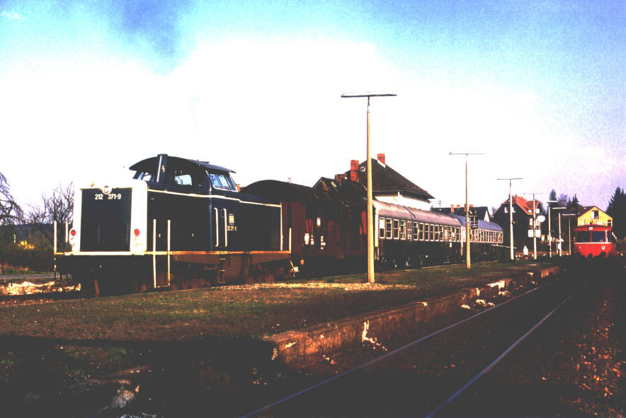 212 371-9 am 19.04.1988 vor N 8784 in Usingen. Der zweite Wagen ist der Expressgutwagen! © Markus Göttert, |
