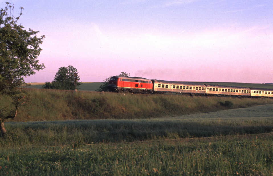 Dieser Zug wurde von einer 216 gezogen und bestand aus drei bis vier Silberlingen, auch mit 1.Klasse. Bild links: 216 199 am 14.06.1989 vor N 8163 kurz