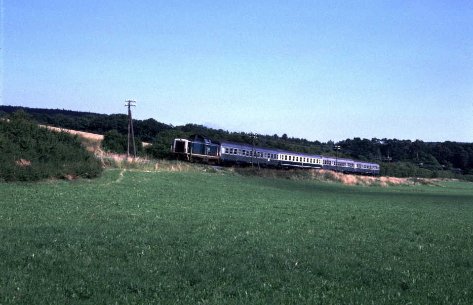 Noch vor der Stillegung des Abschnitts Albshausen-Grävenwiesbach wurde das Wagenmaterial erneut umgestellt. Die Umbauwagen wurden durch Mitteleinstiegswagen (AByl, Byl, BDyl) ersetzt, die nun wiederum durch andere Wagentypen ergänzt wurden, oftmals nun die allgegenwärtigen Silberlinge (ABn, Bn). Ursprünglich als Vier-Wagen-Zug im Reihungsplan stehend wurde der N8761 jedoch schon bald auf drei Wagen reduziert. Da die Mitteleinstiegswagen zum großen Teil türkis/beige lackiert waren, gab es kurz vor dem Ende der Solmstalbahn im Reisezugverkehr noch die Möglichkeit, einen zusammen mit der 216 einheitlich lackierten Zug zu erleben. Allerdings war der N8761 auch der einzige lokbespannte Reisezug auf dem Abschnitt. Ansonsten dominierten weiterhin die Schienenbusse, nach der Abstellung der letzten einmotorigen 795 zum 01.06.1980 allerdings ausschließlich die zweimotorigen 798. |