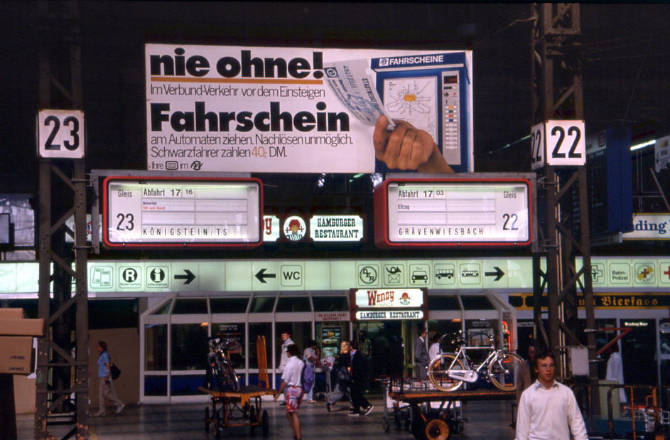 18.07.1989: Der Zugzielanzeiger in Ffm Hbf zeigt am Gleis 23 17:16