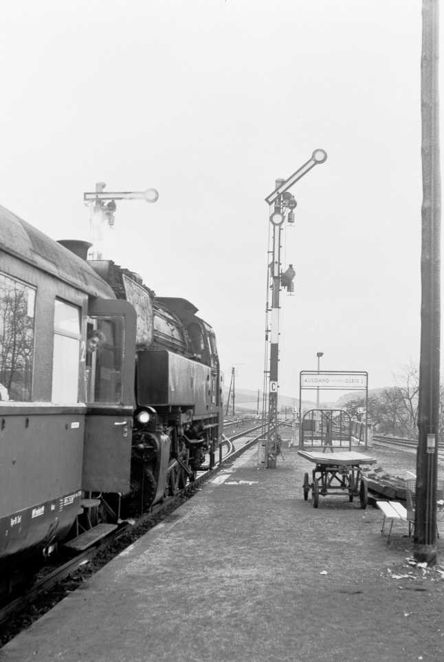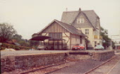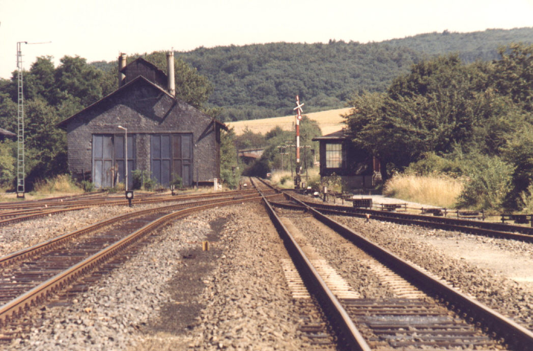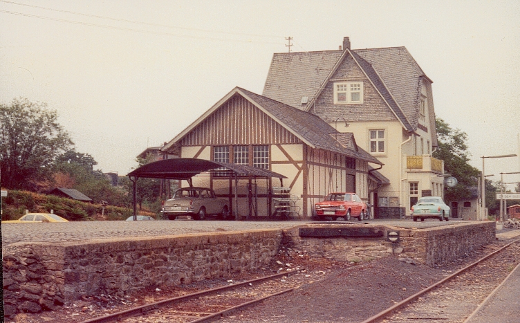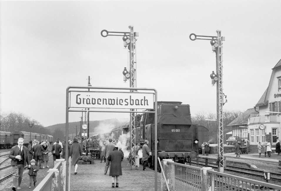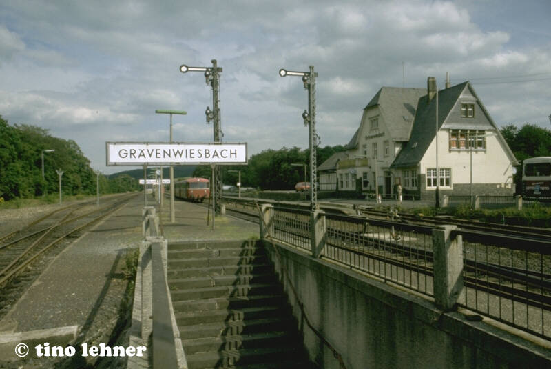 Der 1909 entstandene Bahnhof von Grävenwiesbach war zunächst Kopfbahnhof, denn der neu eröffnete Abschnitt Usingen - Weilmünster erforderte hier der Topographie wegen eine entsprechende Anlage. Geplant war aber schon der 1912 erfolgte Weiterbau in das Solmsbachtal, das allerdings nur durch einen 1300 Meter langen Tunnel erreichbar war. Der ländliche Bahnknotenpunkt wies eine großzügige Gleisanlage auf. Einfahrend linker Hand lag zunächst das noch bis 1993 betriebene „Ausziehgleis“, sodann weiter links etwas tiefer liegend das Streckengleis der Eisenbahnstrecke nach Weilmünster und Weilburg. |