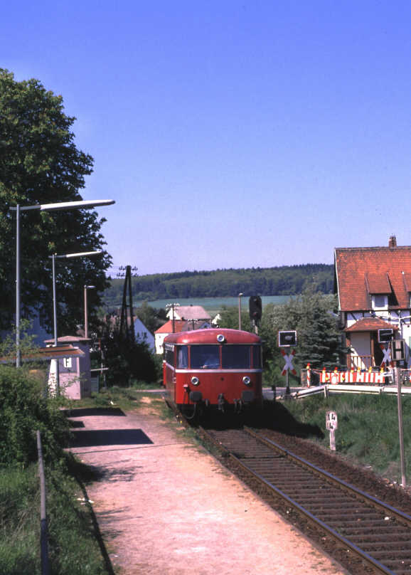 Ein VT 51 auf dem Weg nach Bad Homburg am Bahnübergang in Hausen.