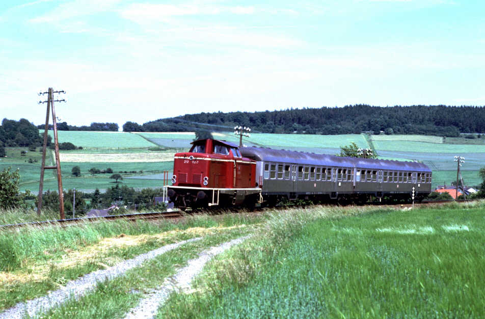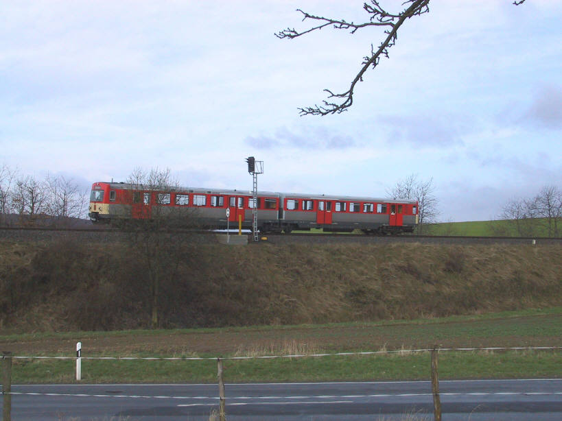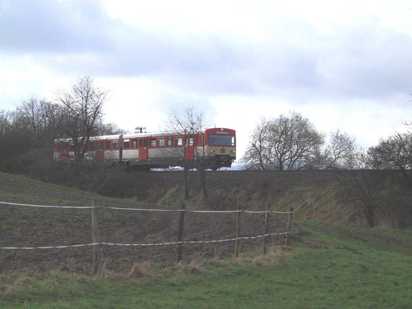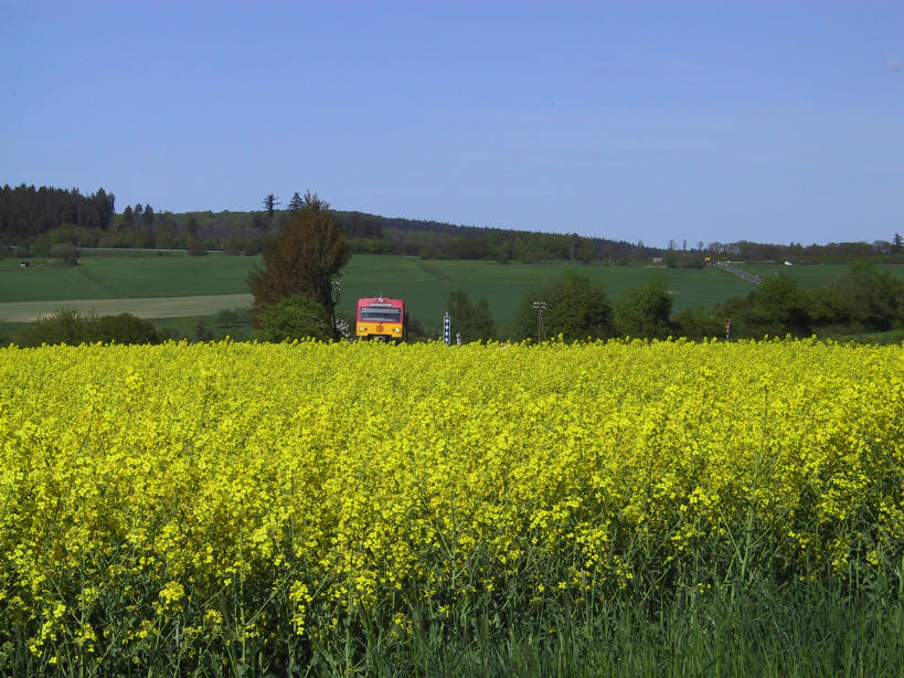 Von links kommt der Zug aus Grävenwiesbach, fährt vorbei am Dorf Naunstadt und kommt nach Hundstadt. Dann geht’s weiter in einer großen Rechtskurve in Richtung Wilhelmsdorf. Klick auf das Bild läd eine Quicktimeversion! |