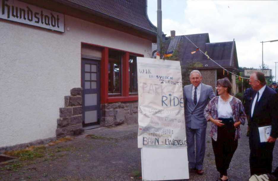 V. l. n. r.: Dr. Klaus-Peter Jürgens (Landrat), die Hausherrin und Dr. Jürgen Kastner (Bundesbahn- Direktionspräsident) © Jürgen Leindecker |