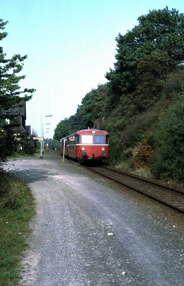 Den Wald verlassend, senkt sich das Gleis in einer imposanten Schleife - der Hundstadter Kurve - mit weitem Ausblick nach Hundstadt, einem Haltepunkt der Taunusbahn, dessen Bahnhofsgebäude ebenfalls verkauft wurde. Nach einer nochmaligen Kehre um den Hardtkopf ist der Bahnhof Grävenwiesbach erreicht, von 1985 bis 1999 Endpunkt der Taunusbahn. |