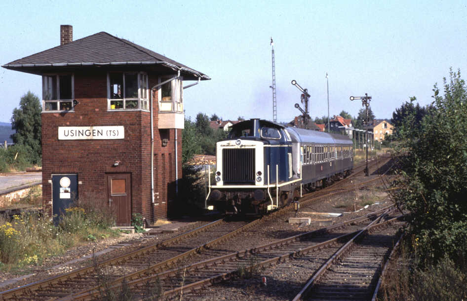 Betrieblicher Mittelpunkt der Taunusbahn ist der Bahnhof der früheren Kreisstadt Usingen. Hier befinden sich umfangreiche Abstellanlagen und das Zentralstellwerk der Taunusbahn, von dem aus die gesamte Strecke gesteuert wird. Der Bahnhof besitzt einen Mittelbahnsteig und das ehemalige Bahnhofsgebäude aus dem Jahr 1895 ist noch vorhanden, wenngleich leider heruntergekommen. |