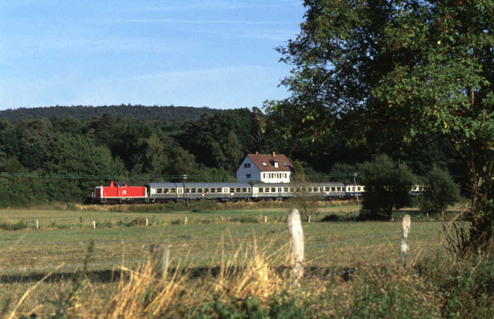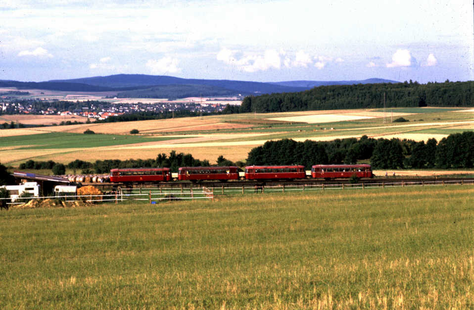 Hinter dem Bahnhof Saalburg führt die Strecke in mehreren weit ausholenden Bogen durch das waldlose Usinger Becken. Der Bahnhof Wehrheim liegt unmittelbar hinter einem Bahnübergang über die alte B 456 Bad Homburg - Weilburg, die die Bahn in mehr oder minder großer Entfernung nunmehr begleitet. Wehrheim und Neu Anspach mit seinen Ortsteilen Hausen und Arnsbach haben sich in den letzten Jahrzehnten zu wichtigen Siedlungspunkten entwickelt. Seit den siebziger Jahren ist Neu-Anspach von der Regionalen Planungsgemeinschaft Untermain zum „Siedlungsschwerpunkt“ erkoren worden. |