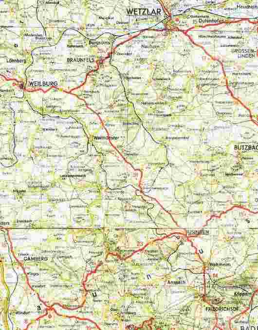 Am linken Rand der Karte liegt Weilburg, wo die Weil in die Lahn